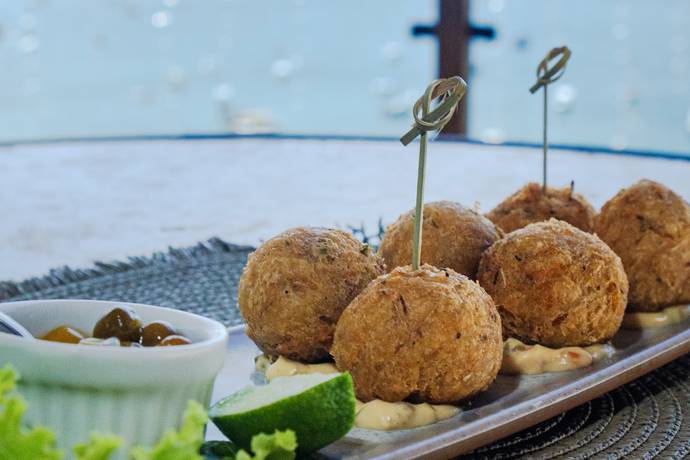 Dadinho de tapioca com camarão, cream cheese e géleia de abacaxi.